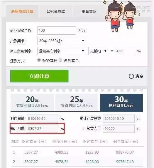 也就是说,如果我们贷款100万,贷30年,那么公积金贷款方式下,我们每月的月供是4352.06元;商业贷款方式下,我们的月供是5307.27元。