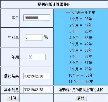 手里剩下的100万,他打算拿来投资,每年投资收益率能达到5%,期限也是30年,每年再复利一次,这样的话到期的利息就是:332万。